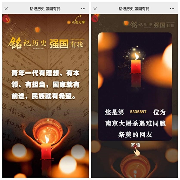 本次活动采用 H5 新媒体互动页面的形式,通过“答题”“点烛”“选择寄语”等环节进行互动,并运用微信朋友圈进行传播,反响强烈。同学们“点烛”祭奠南京大屠杀遇难同胞,祈愿和平,深切缅怀遇难同胞,更加深刻感受到今天幸福生活的来之不易,厚植了家国情怀。