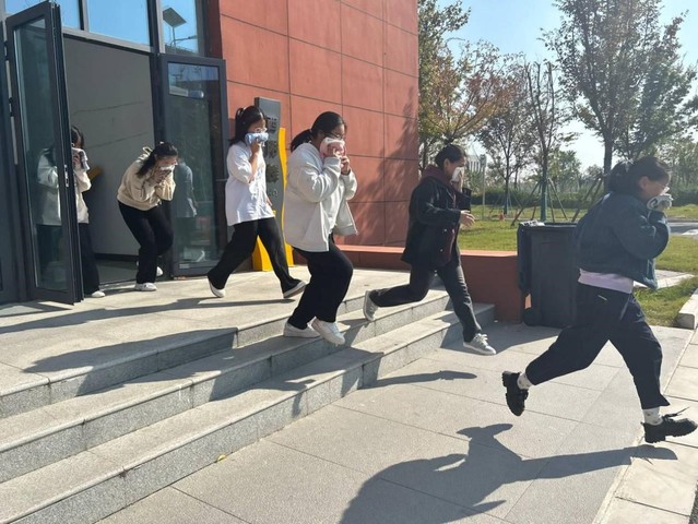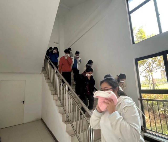 下午两点,演练正式开始,员工启动疏散流程。宿舍楼、教学楼内各疏散口、楼梯口等重点区域的引导员迅速就位,指导员工使用湿毛巾捂住口鼻,弯腰低姿态有秩序地按指定路线向集结地撤离。教学楼外,各班紧急疏散到指定的安全区域后,自觉清点人数,向上汇报。在宿舍的同学同样迅速作出反应,互相提醒着按指引跑出宿舍楼。整个演练过程组织有序,撤离迅速,紧张而不慌乱。本次消防演练活动,同学们顺利在规定时间内完成疏散,未出现员工困在出口处或人员聚集踩踏等情况。