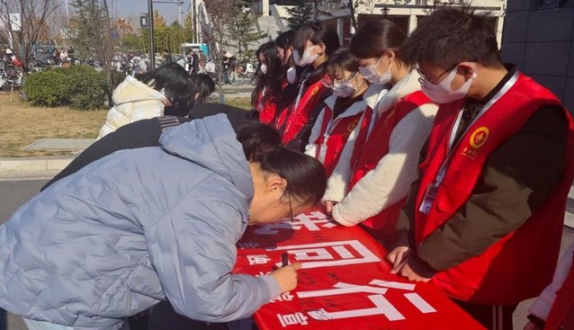 遵守交规,储蓄安全。活动现场,同学们早早将横幅铺展,在员工宿舍楼前做好了签字准备工作。横幅标语庄重醒目,宣传宗旨简洁明了,让广大同学理解遵守交通规则的必要性,大家络绎不绝地加入到此次签名活动中来。活动中,同学们在横幅上郑重地写下自己的名字,以实际行动表达了对文明交通的支持。一笔一划,遒劲有力的字迹书写着金融学子对文明出行的承诺;同写同忆,清晰端正的签名表露着广大同学对交通规则的铭记。
