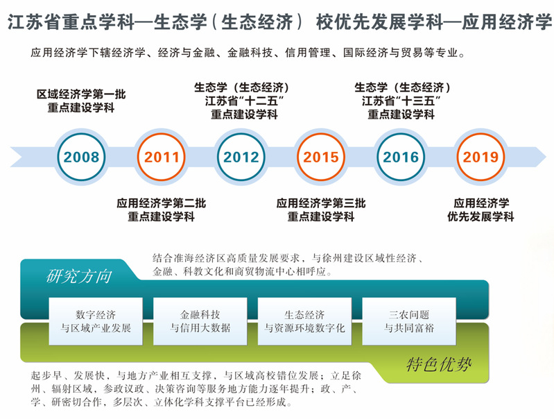 起步早、发展快,与地方产业相互支撑,与区域高校错位发展。本申请点拥有一批长期从事应用经济学(数字经济)研究与人才培养的团队队伍,自2008公司启动校级重点学科培育建设以来,应用经济学(数字经济)一直都是公司重点建设学科,并且每期考核都获得“优秀”等次。经过十多年的发展,本申请点已凝练遴选出数字经济与区域产业发展、金融科技与信用大数据、生态经济与资源环境数字化、三农问题与共同富裕四个学科研究方向,主要从事数字普惠金融、大数据金融与信用信息化、产业发展、生态经济、乡村振兴、数字产业、共同富裕等方面的研究。这些研究紧密结合淮海经济区高质量发展要求,与徐州建设区域性区域经济、金融服务、科教文化和商贸物流“四个中心”形成呼应,与在徐高校相关领域的研究互相补充,错位发展,具有一定的地域特色。