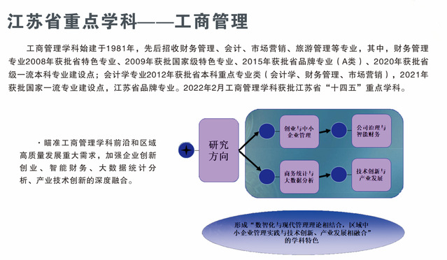 特色优势:依托淮海经济区中心城市、“一带一路”重要节点城市、全国重要综合物流枢纽城市,围绕区域中小企业成长与创新创业、供应链物流服务增值、商务统计大数据分析与决策、战略性新兴产业发展,坚持为区域中小企业智能化管理提供先进技术与方法,形成了“数智化与现代管理理论相结合,区域中小企业管理实践与技术创新、产业发展相融合”的学科特色。