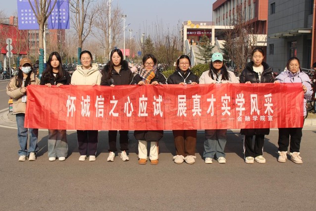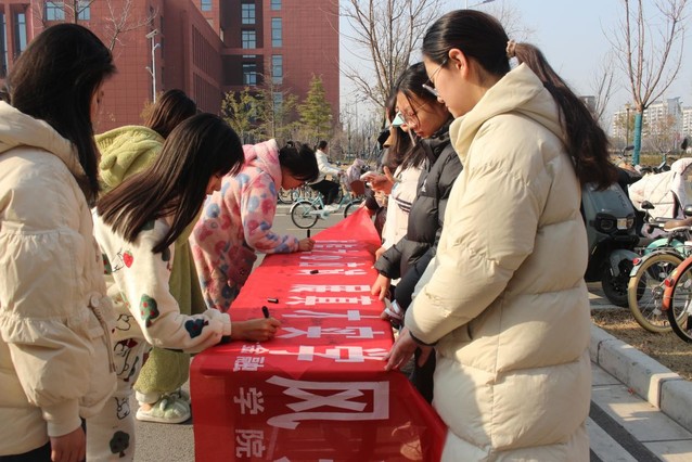 以诚为笔书佳绩,用德作墨绘华章。活动当日,八号楼前拉起了醒目的红色横幅,员工们在横幅上郑重签下自己的名字,每一笔都透露出金融学子对诚信考试的庄重承诺。签字活动结束后,横幅被悬挂在校园内显眼的位置,在无形中提醒着每一位同学不忘初心,诚信应考。